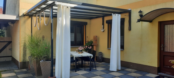 Auf der überdachten Terrasse im Hof stehen für Sie Gartenmöbel , Sonnenliegen, und ein fest stehender Grill .