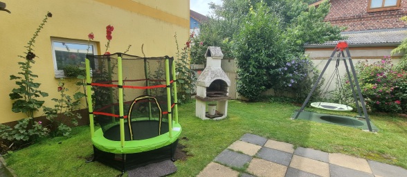 Im Wohnzimmer stehen Ihnen eine Eckcouch, ein Sessel, kleine Musikanlage , Fernseher ( Sat – Anlage ), DVD-Player + Filme, Bücher für Kinder und Erwachsene sowie diverse Familienspiele zur Verfügung